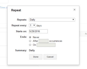 One feature I really like about Google Calendar is the ability to make tasks recurring. You could use this function for classes, specific study groups, or other repeatable tasks. I actually have a daily reminder on when I need to go to bed . . . to make sure I’m getting as much sleep as I should.