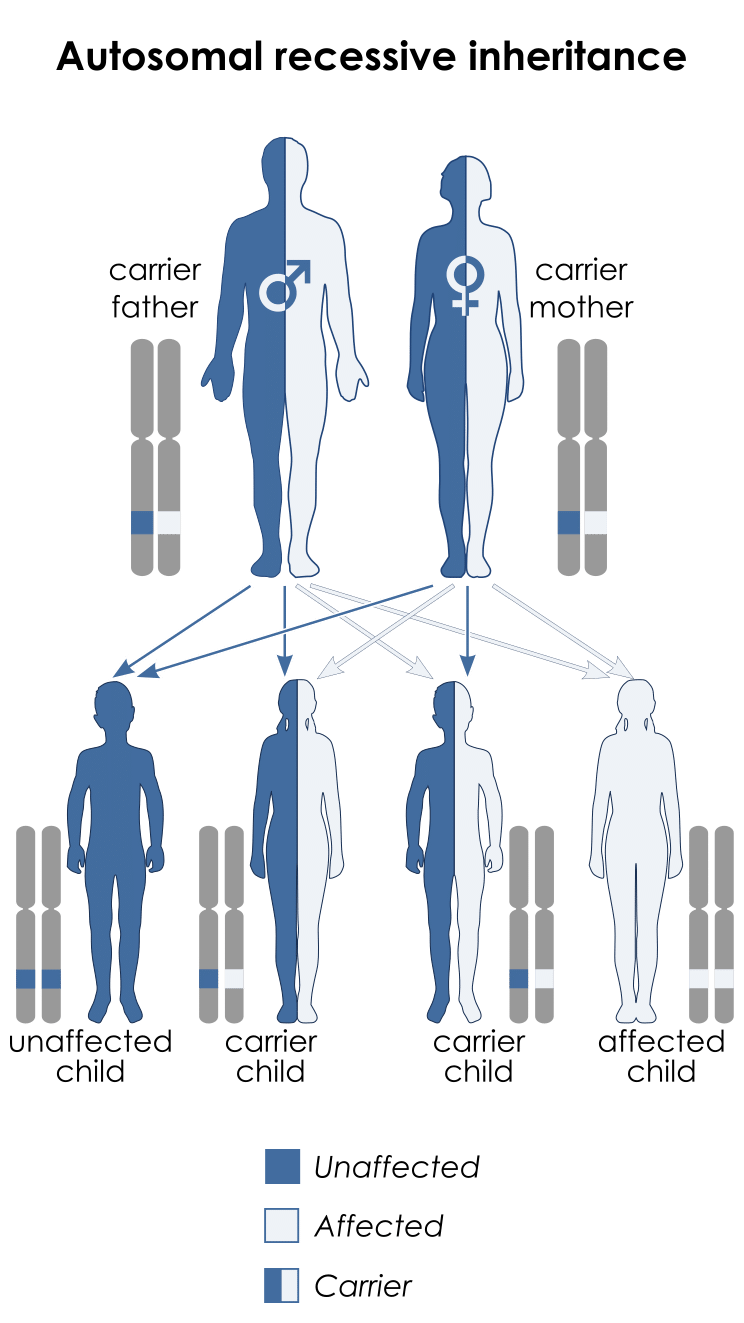 This diagram shows the transmission of autosomal recessive genes, such as the ones that cause cystic fibrosis and a small number of cerebral palsy cases.