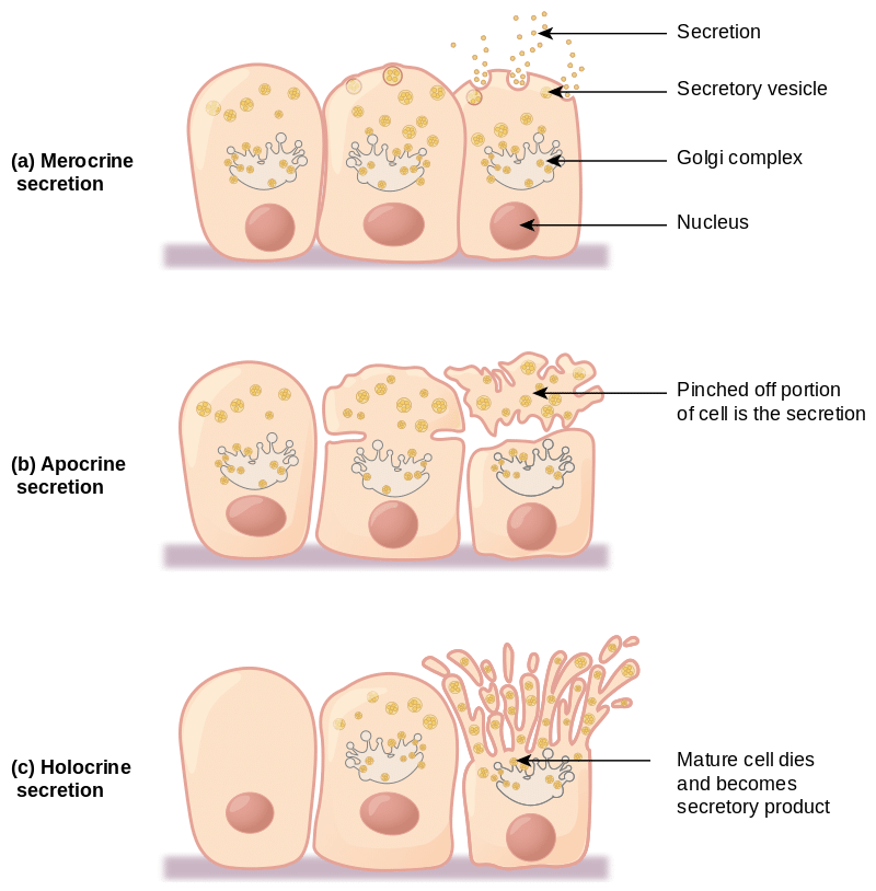 Merocrine glands have special secretory vesicles, which release contents. Apocrine glands pinch off a portion of the cell body to release substances and holocrine glands secrete their substance by cellular death.