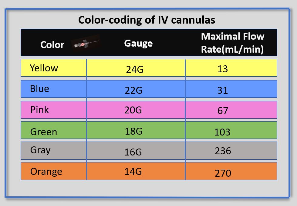 For IV cannulas or angiocaths, you can quickly identify the gauge of the cannula by looking at the color of the hub.