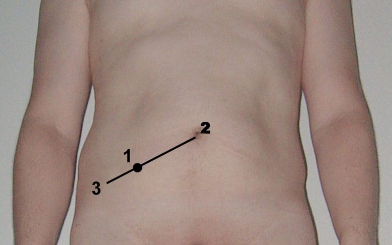 A nursing caring for an eight-year-old with appendicitis knows that the most intense area of pain may be at McBurney’s point, which is located where on the abdomen?
