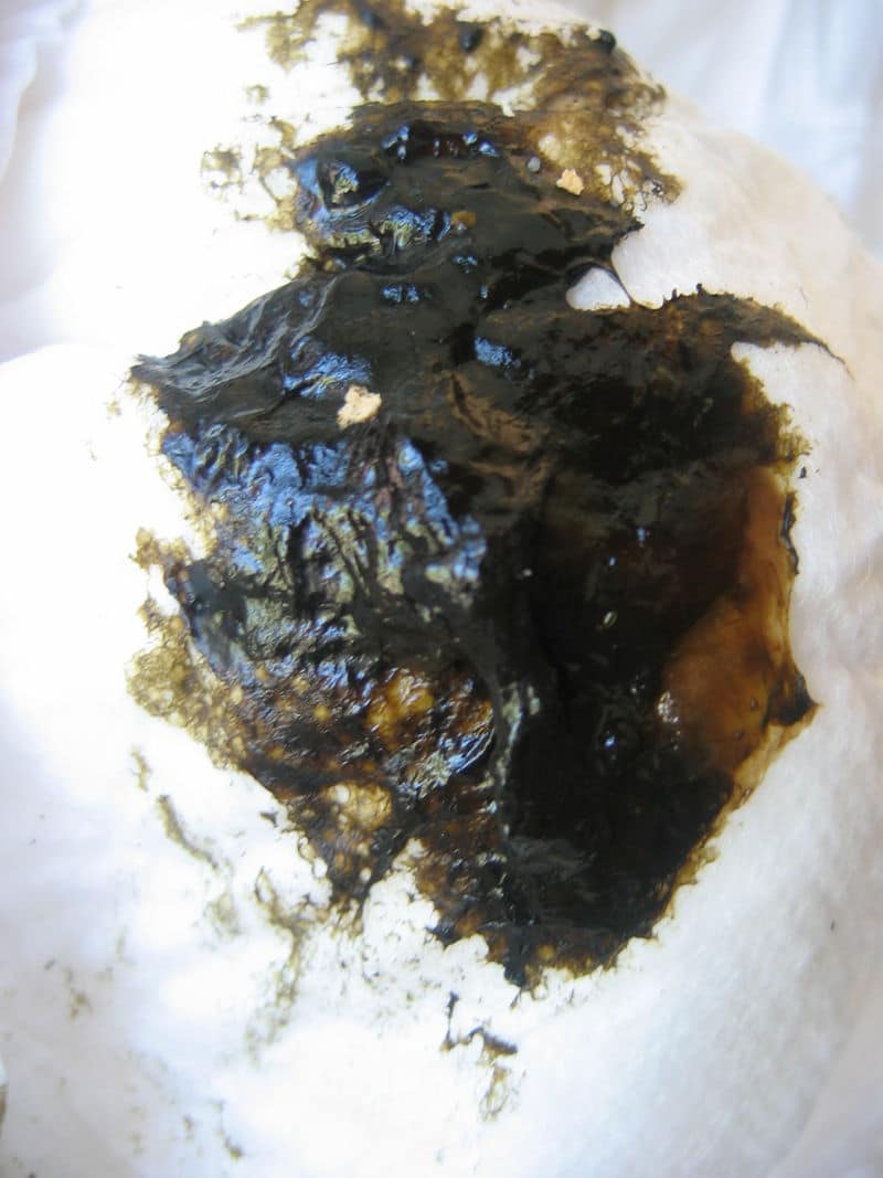 Meconium is the first passing of stool from a newborn. It is greenish brown and thick. As the baby is fed over the first few days, the stool becomes more of a light brown and soft