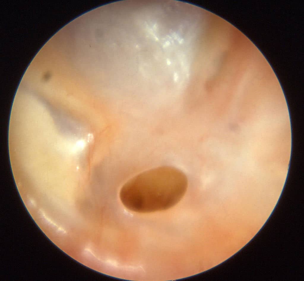 Otitis media can cause a perforation in the eardrum, seen as a hole in this image